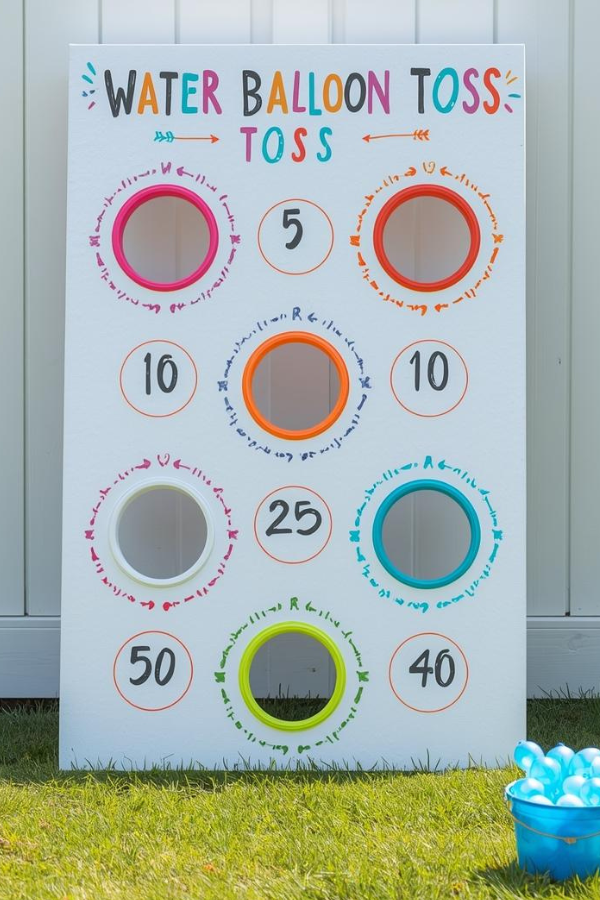 Give each child five water balloons and let them take turns tossing through the holes. Each hole can be worth different points, and players add up their scores at the end.